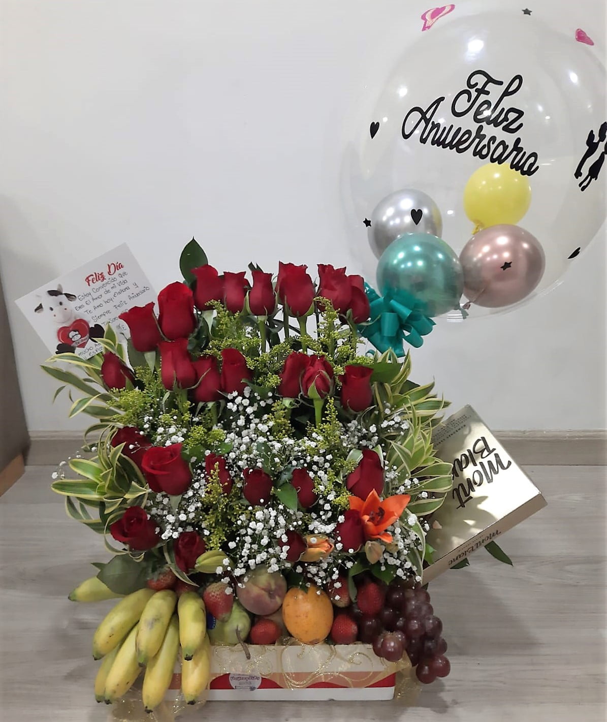 Cuidando cada detalle, encontraras una selección de frutas frescas y de temporada, 20 rosas frescas tipo exportación, en una base delicada y perfectamente decorada.