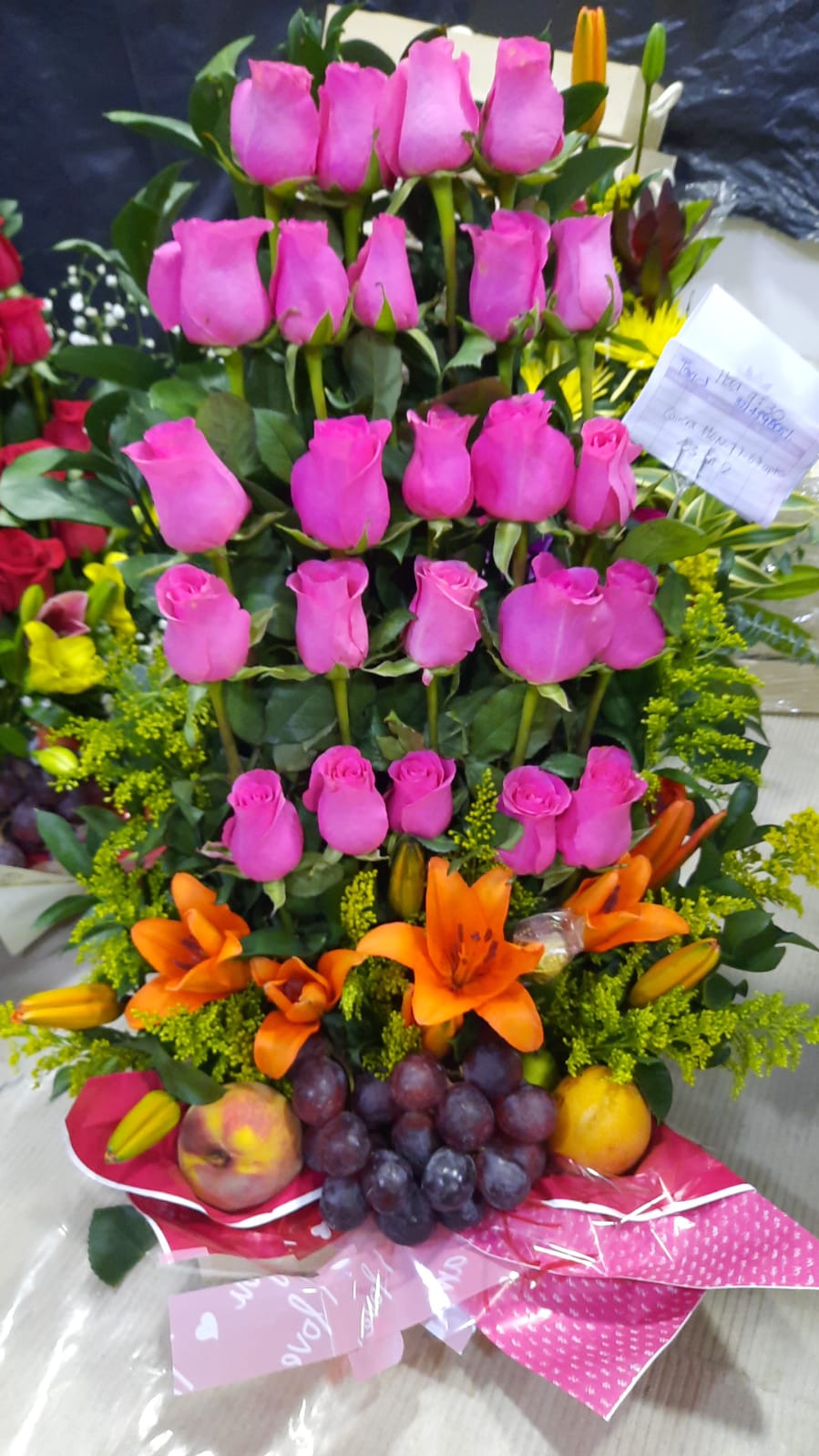 Cuidando cada detalle, encontraras una selección de frutas frescas y de temporada,  rosas frescas tipo exportación, en una base delicada y perfectamente decorada.